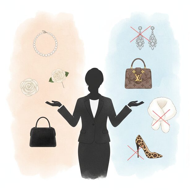 バッグやアクセサリー、靴などに大きなブランドロゴが入っているものは、マナー違反と見なされやすいです。特にバッグは、ロゴが正面に大きくプリントされているものは避け、ロゴが目立たないデザインを選びましょう。派手なブランド品を見せびらかす場ではありません。
